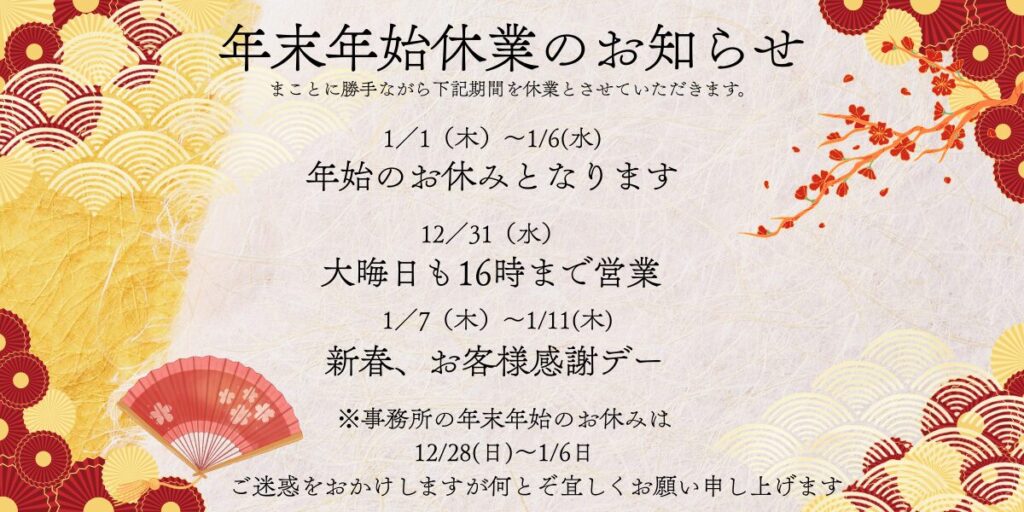 年末と年始のお休みと営業のお知らせのご案内 売店 日頃のご愛顧、誠にありがとうございます。大晦日16時から1月6日(火)は、お休みとさせていただきます。 年末 : 12月31日(水)16時まで営業 年始 : 1月7日(水)より営業 事務所 日頃のご愛顧、誠にありがと... -