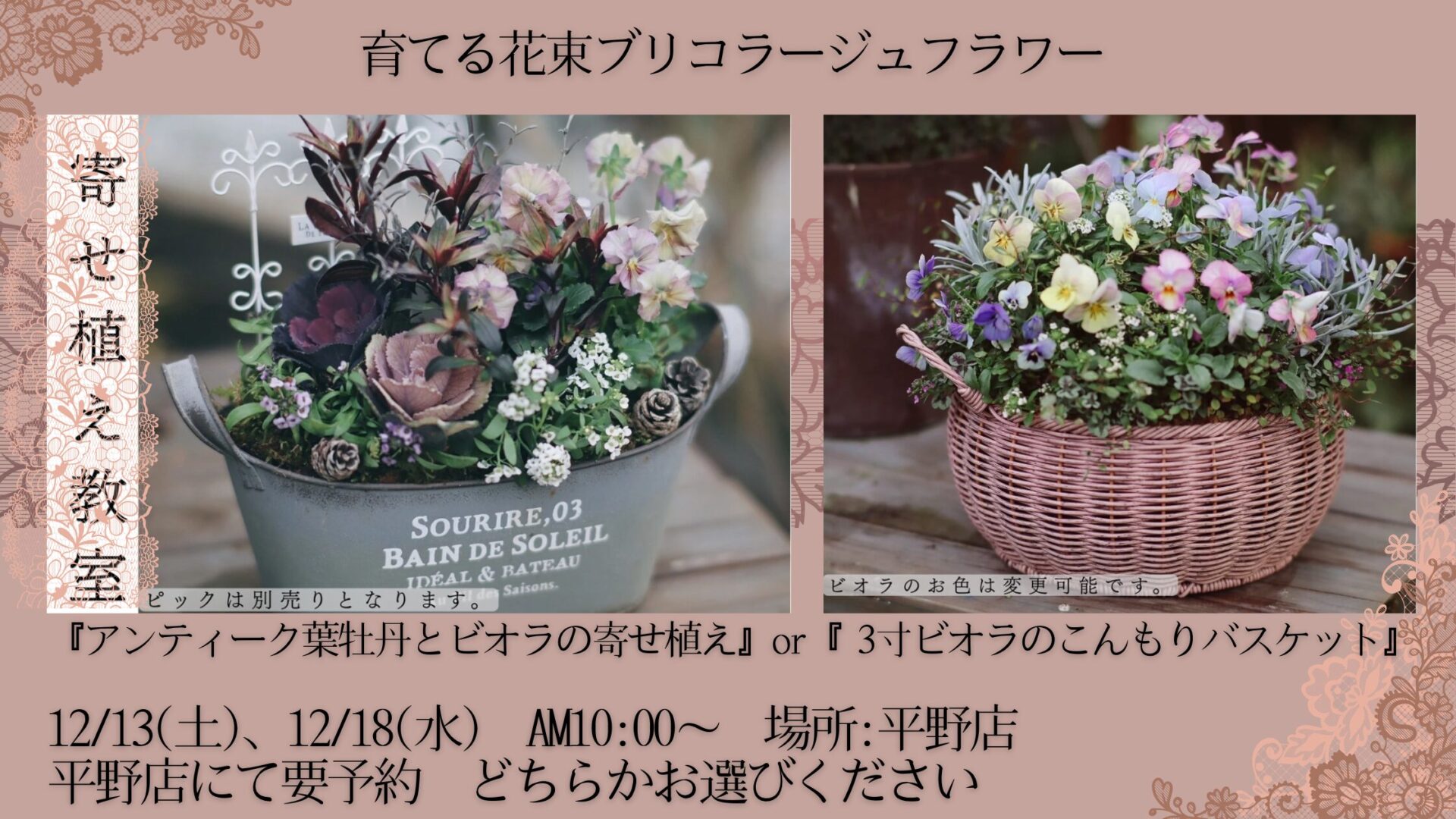 12月の上旬、中旬に平野店 @meikoen_hirano でブリコラージュの寄せ植え教室を開催します😊